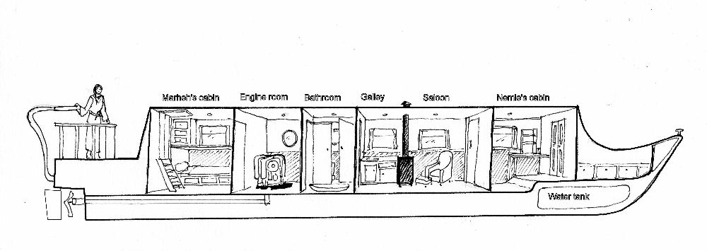 She led Marheh through the cabin to the engine room, the big engine shining with her care, just waiting to be awakened. Then they passed the tiny cubicle that housed the toilet bucket and reached the galley with the saloon beyond it. She heard Marheh’s little gasp of delight as she took in the neat, compact space. The morning sun bounced off the water and filled the boat with light. The kettle gently steamed at the back of the stove. Everything that could possibly sparkle did so. The sink and the stove defined the small corner that was the galley. The chimney for stove and fire reached to the roof, black and shining. There were green curtains at the windows with a pattern of wildflowers. The lower sides were panelled in light golden timber, the lining of the roof and topsides was painted a very pale grey-green.  There was a big green armchair and a matching footstool by the fire and a small table and two little benches built against the opposite wall. Beyond that was the door to Nemle’s cabin, firmly closed.
